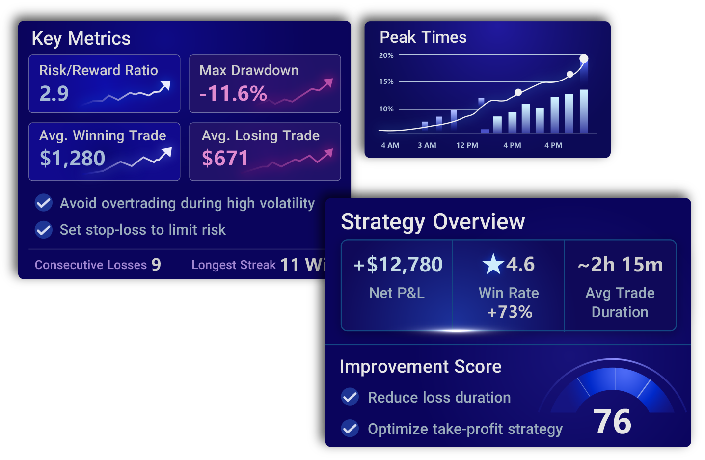 Machine learning analyzes your trade data to uncover weaknesses and strengths using Net P&L, cumulative performance, win/loss streaks, and trade duration to boost consistency and performance and improve your win ratio through intelligent data evaluation.