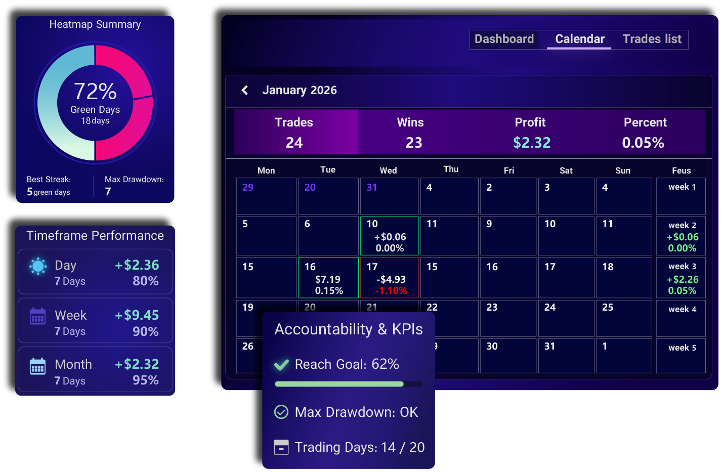Analyze your trading performance by day, week, or month. Clearly visualize green and red periods while customizing P&L data for deeper insights. Unlock a heatmap view of your trading journey. Track performance, stay accountable, and consistently smash your monthly goals and KPIs.