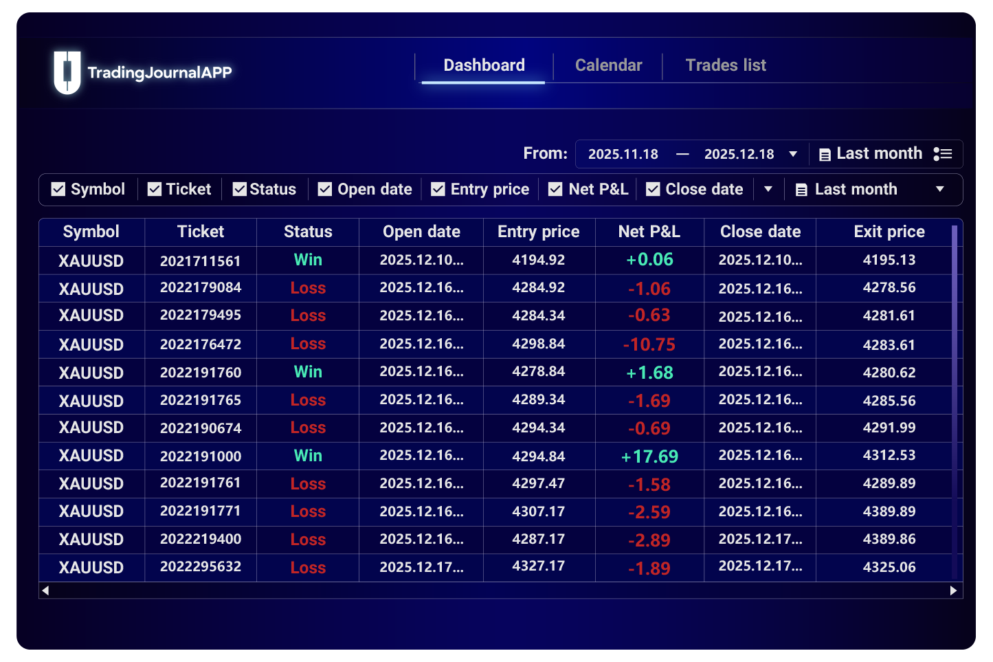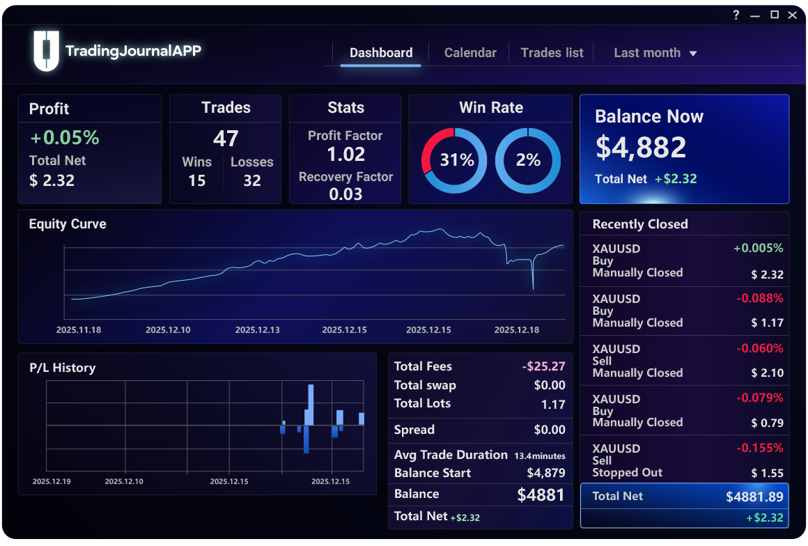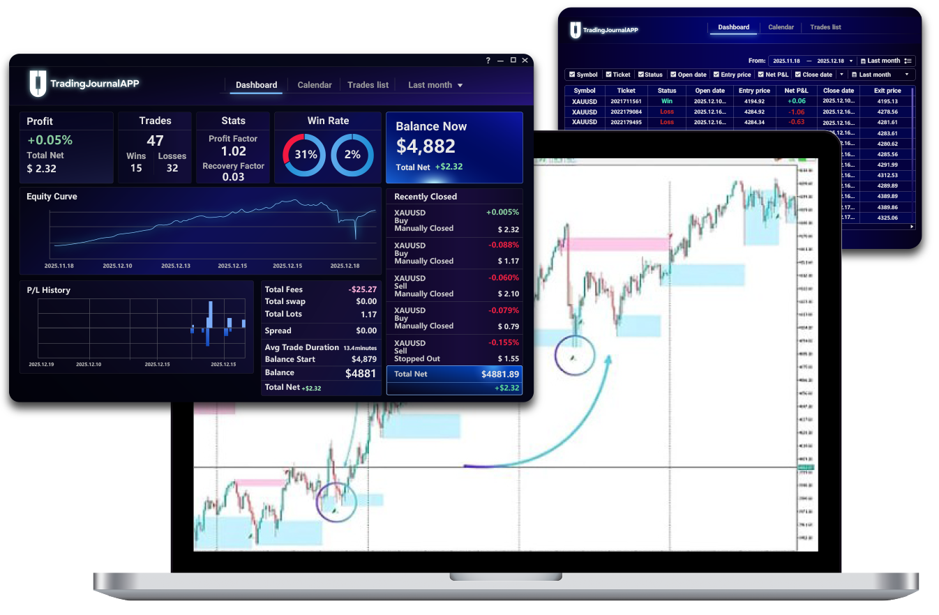 Repeat and analyze your strongest setups and winning patterns. Add notes and tags to every trade until skill turns into consistency.